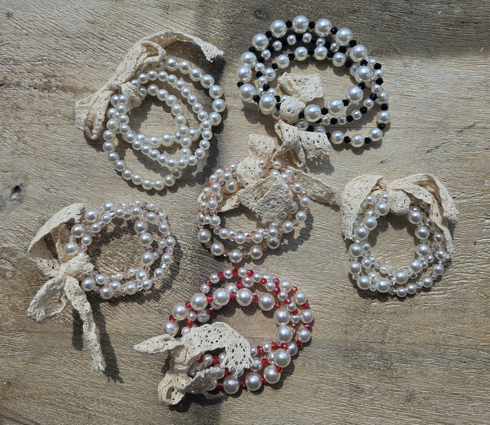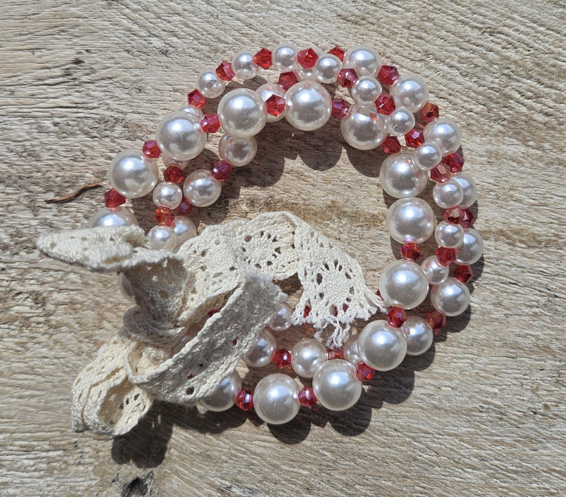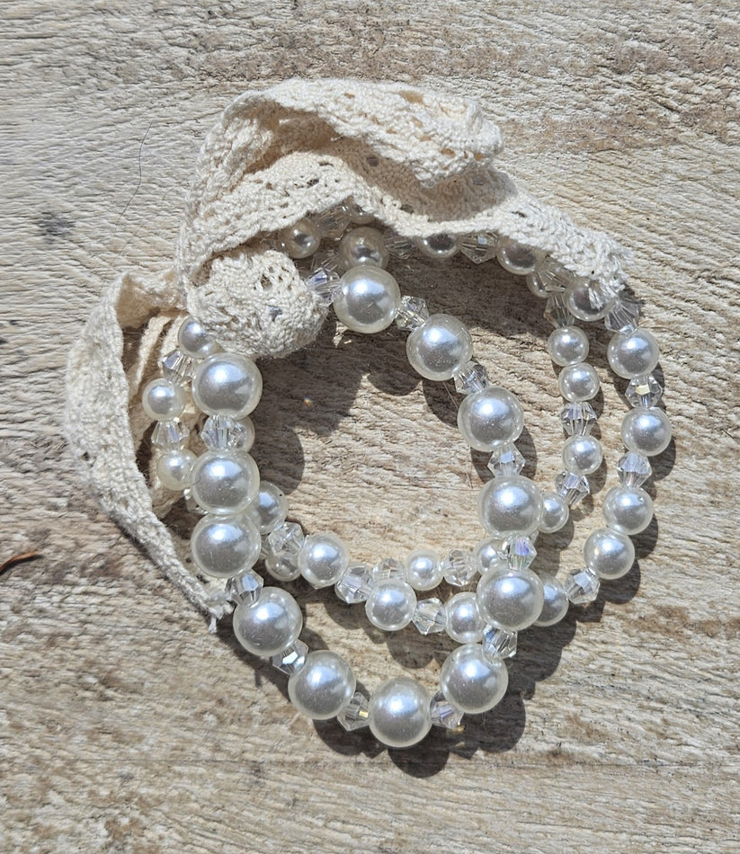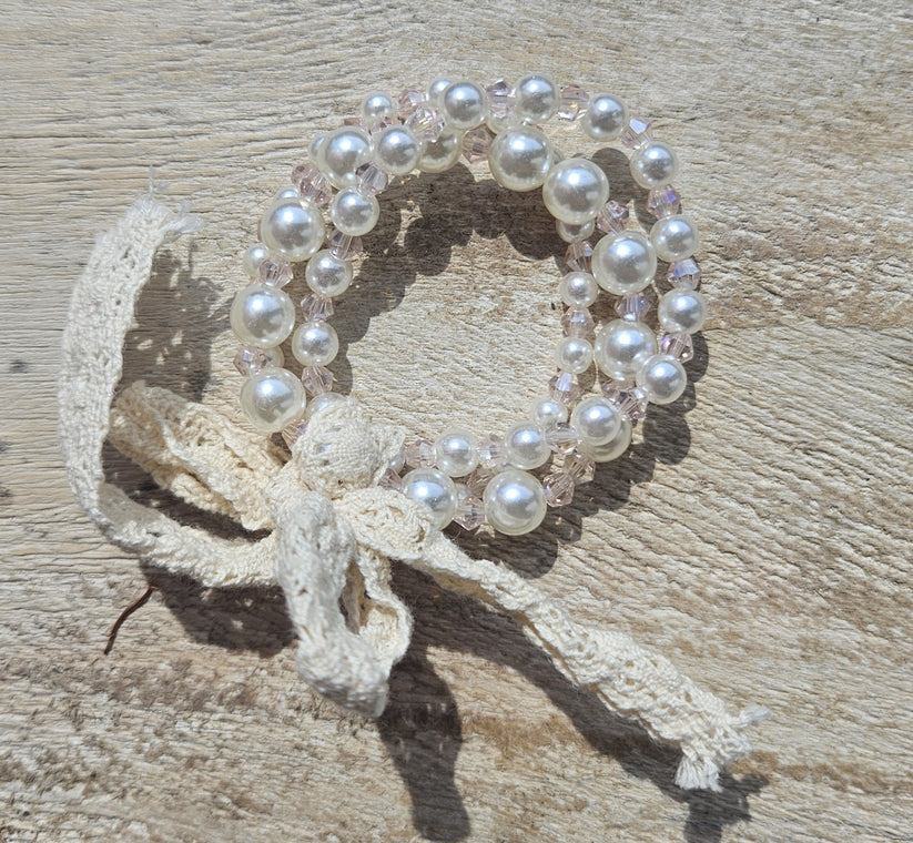 This is a charming set of three bracelets perfect for your little one. Featuring delicate pearl and lace designs, this accessory adds a touch of elegance to any outfit.